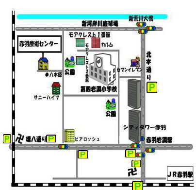 ◆赤羽岩淵駅からの道のり 3番出口を出てから横断歩道を渡り北本通りを新荒川大橋方面に進み、 セブンイレブン手前の道を左に曲がると、第四岩淵小学校の正門。 左に小学校を見ながらマンションのカルム赤羽、モアクレストの前を通り モアクレスト2番館の隣の公園の中を通り過ぎると 「のぼり」(整体)が見えます。 その脇の道に入ると、当院が見えます。